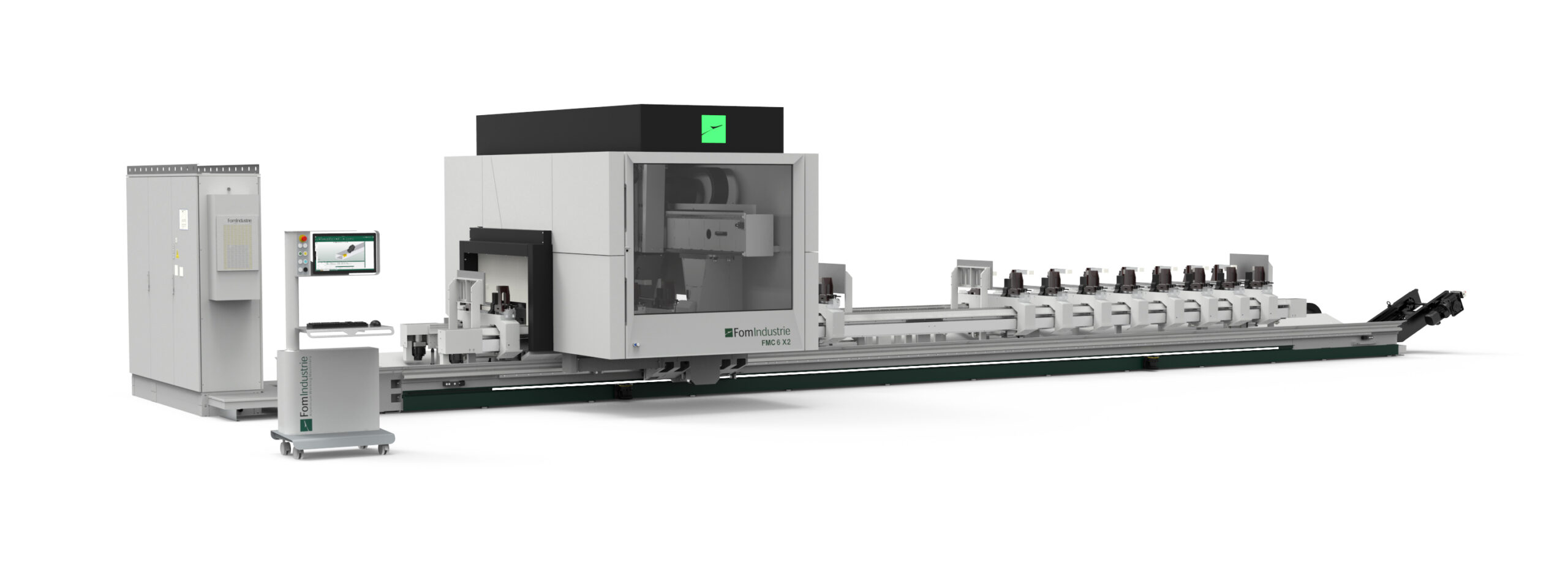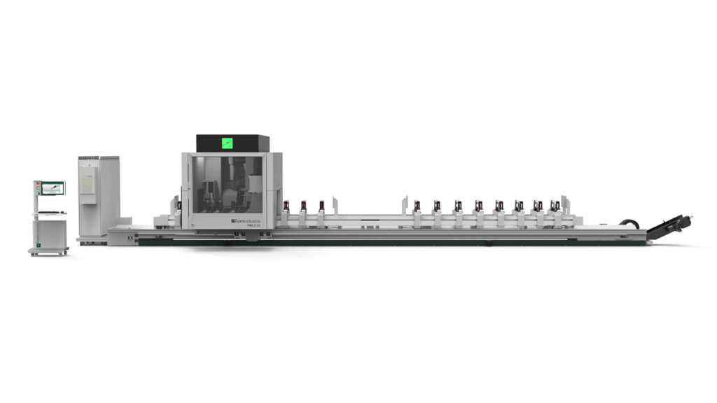 Machining centre with 5 interpolating axes for machining on 5 faces of aluminium profiles with a cross-section of 580 x 400 mm and steel tubes up to 5 mm thick. HSK E63 22 KW 24000 rpm liquid-cooled electrospindle allows the production of custom machined and milled elements. According to the configuration chosen it is possible to carry out single area, double area, pendular or multi-piece machining (up to 8 pieces with XPAL). 6 versions are available according to the length of the machine bed and whether or not cutting unit X2 is present.