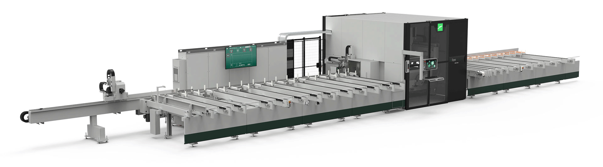 The machining unit LMX 650 tooled up with max 18 electrospindles and the cutting unit with infinite 360° blade rotation produce a continuous flow of processed and cut to measure elements. The additional machining module XMU carries out end milling (with blade, mill or mill units), boring and head tapping, as well as 45° and 135° inclined cuts, guaranteeing maximum flexibility for numerous applications. The high visibility cabin and the presence of the luminous FOM logo indicating the machine status are characteristic of the futuristic design of the system of LMX 650.